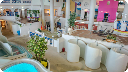 Мореон SPA – самое спокойное и красивое место в комплексе, открыто только для взрослых и детей старше 14 лет. Оформлено в стиле легендарного греческого острова Санторини. В переулках и террасах этого пространства хочется затеряться.