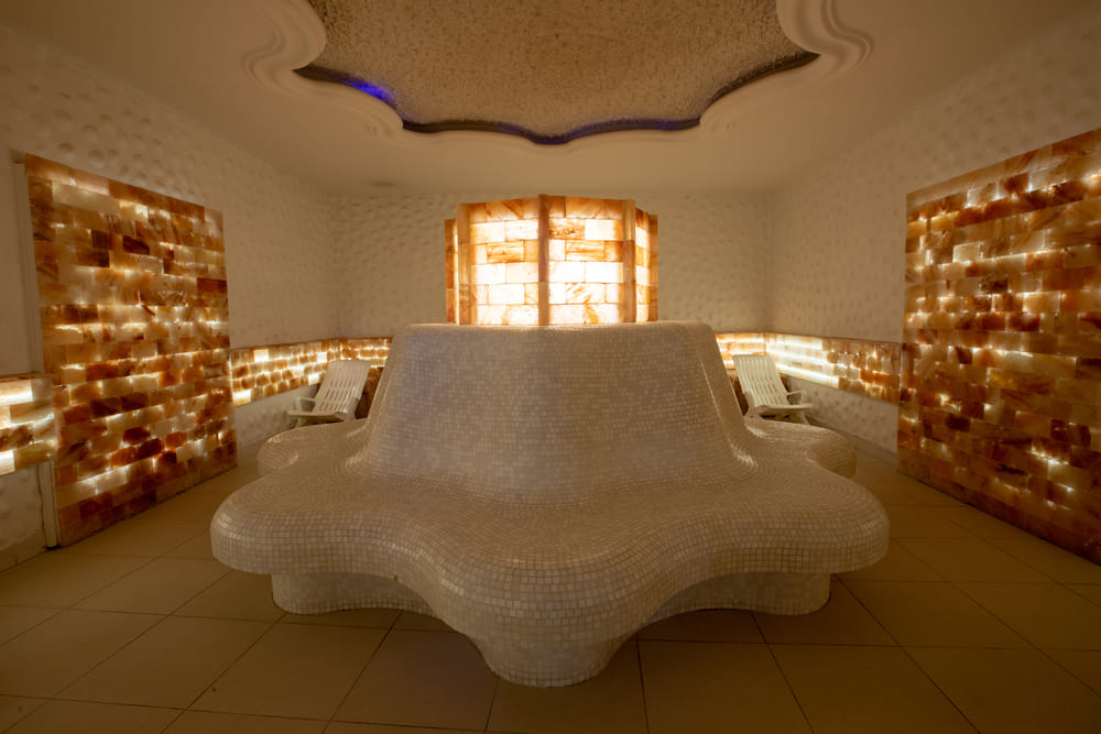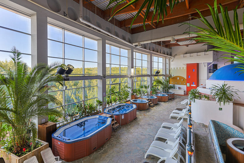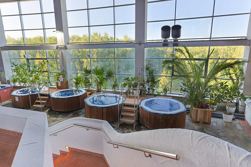 Здесь тоже есть разнообразие бань – римская, хаммам, аромасауна, русская травяная, русская кедровая, греческие бани, ИК-сауны, а также небольшой бассейн, дорожка Кнайпа и соляная пещера.