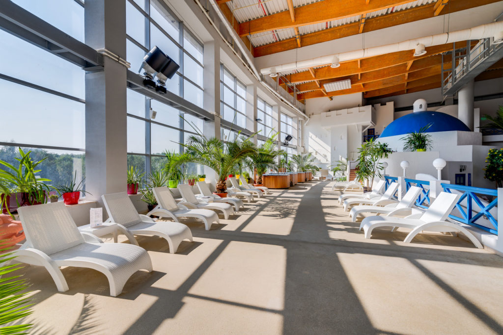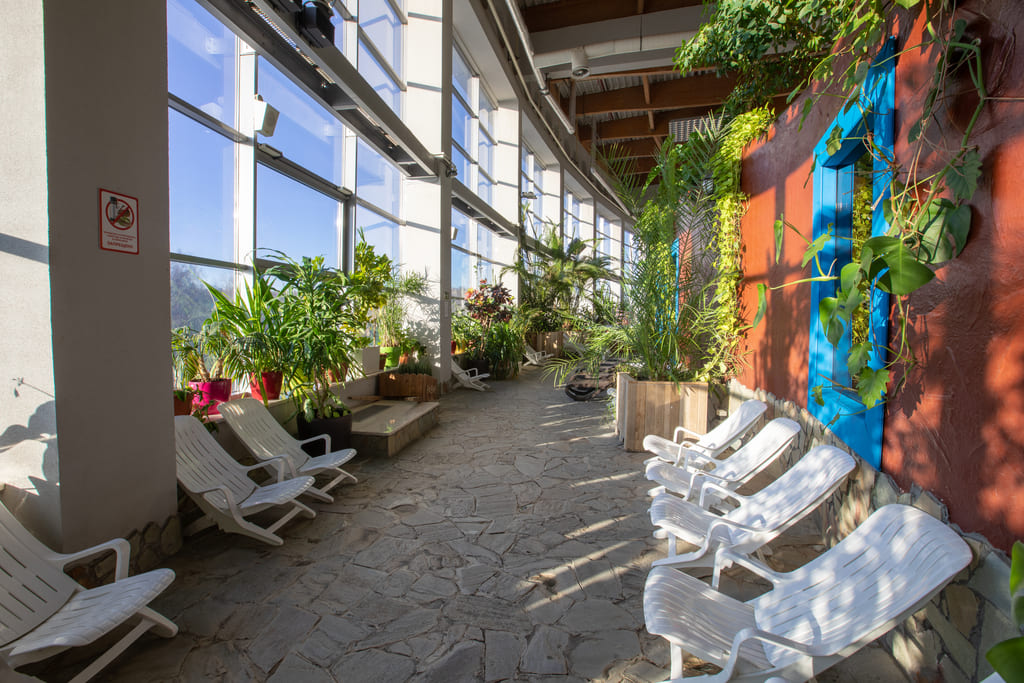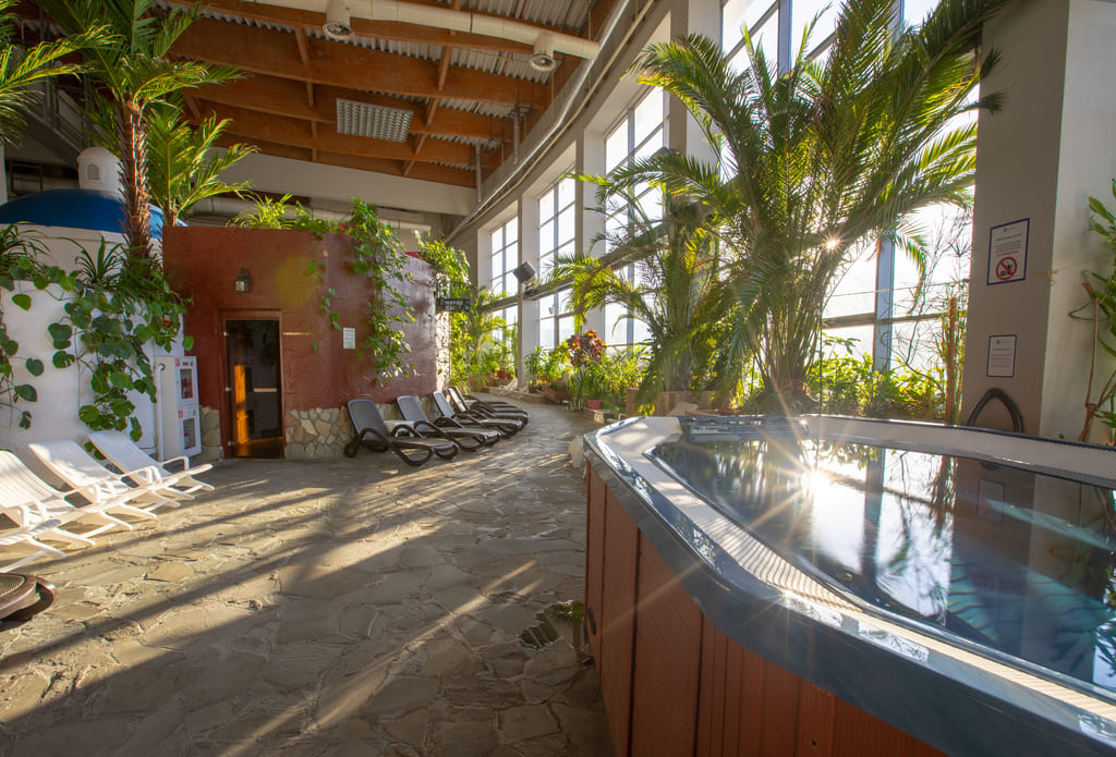 Термы – масштабный банный комплекс. По формату напоминает общественные бани, но намного интереснее. За один визит вы можете посетить 19 бань и саун разных мировых традиций – русская баня, финская сауна, хаммам, восточные аромасауны, греческие деликатные бани – тепидариум и лакониум. Главное украшение зоны – двухуровневый бассейн-лабиринт с контрастными ваннами, водопадами и рекой с реверсивным течением. Никогда не пустует античный аэрогидромассажный бассейн. После парной гости освежаются в фригидариуме и ледяных купелях, а отдыхают на лежаках с панорамным видом на березовую рощу или на летней веранде. В Термах можно отдыхать целый день, а перекусить можно здесь же – в кафе с европейской кухней. Есть услуга отдельной русской парной со своим предбанником, купелью и выходом на веранду.